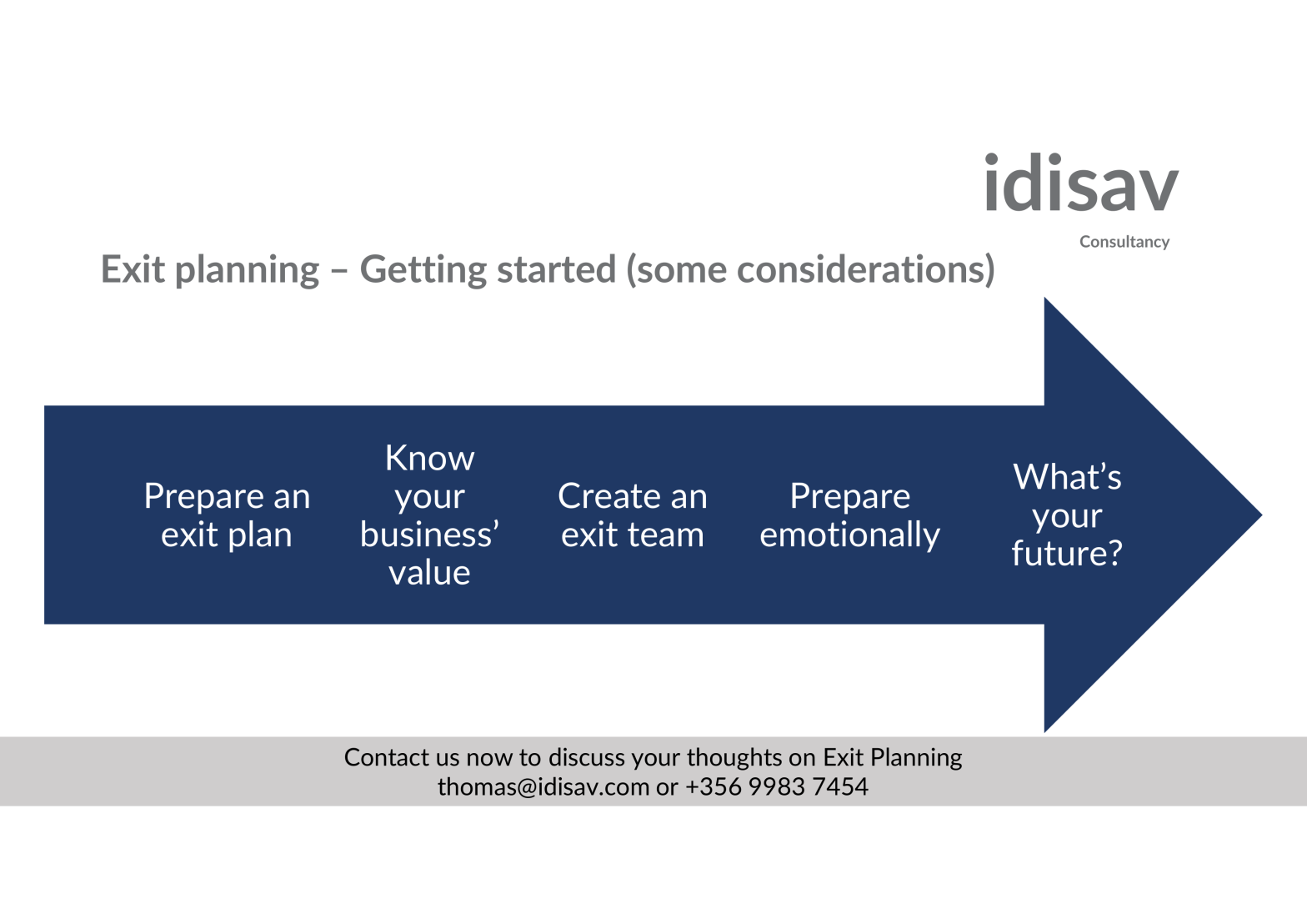 Feel free to contact idisav to discuss your exit strategy. You will be assisted by Thomas Cremona, who apart from being a qualified accountant has undertaken the exit process from an entrepreneur’s perspective with a company he had founded and successfully exited.