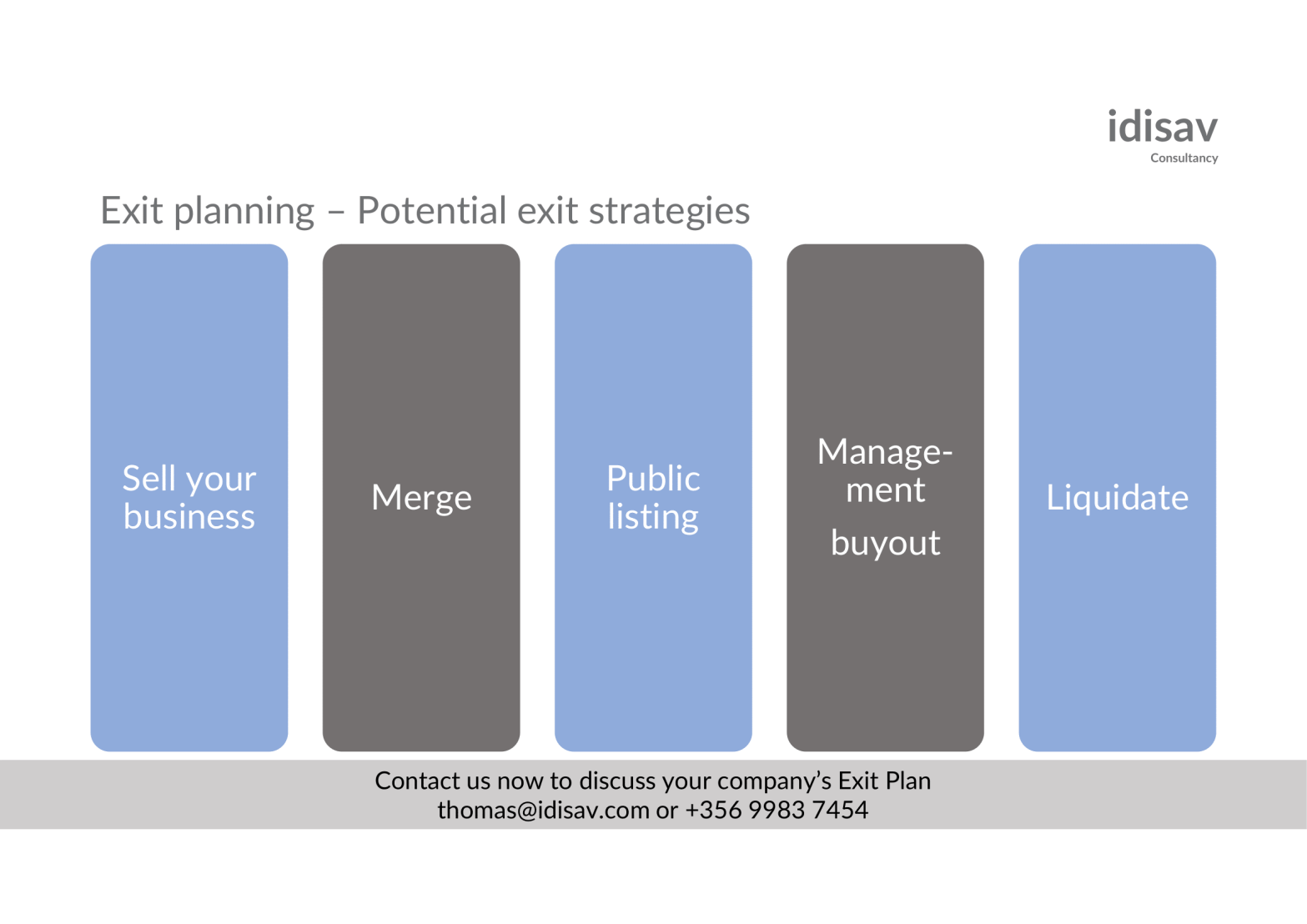 Feel free to contact idisav to discuss your exit strategy.