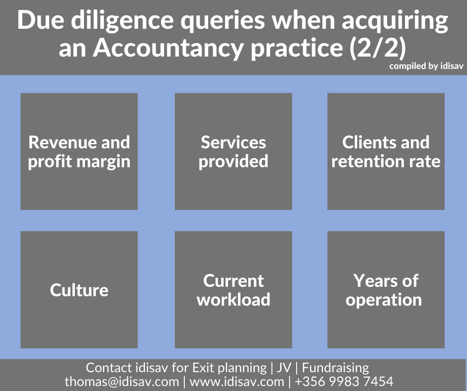 Whilst acquiring a profitable Accountancy practice may be preferred there are a number of other due diligence considerations, such as: