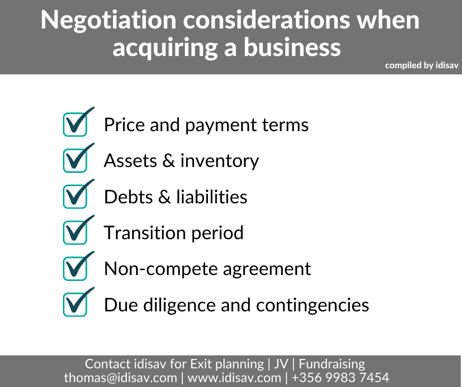 In the process to acquire a business, one may need to negotiate and this may consist of: