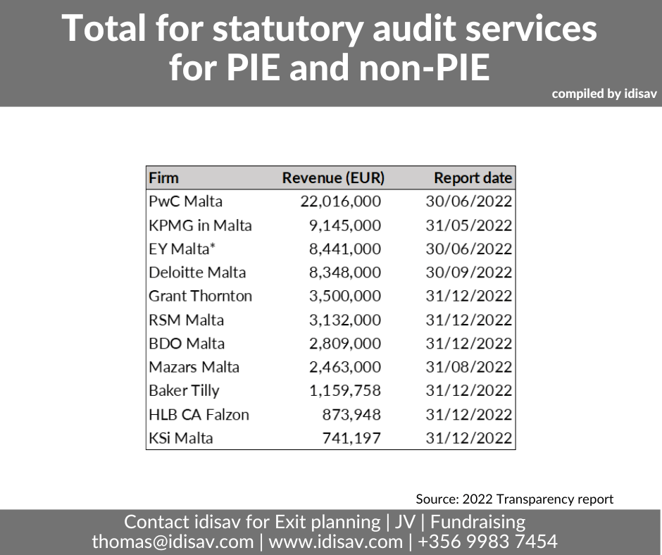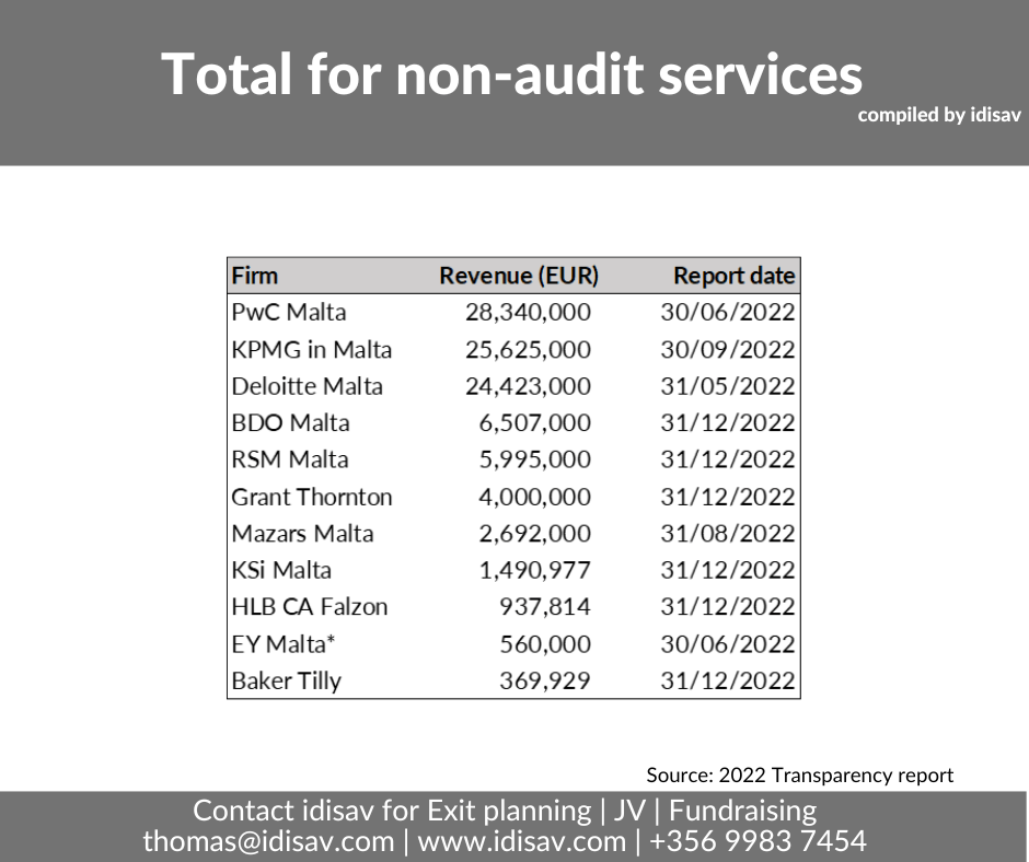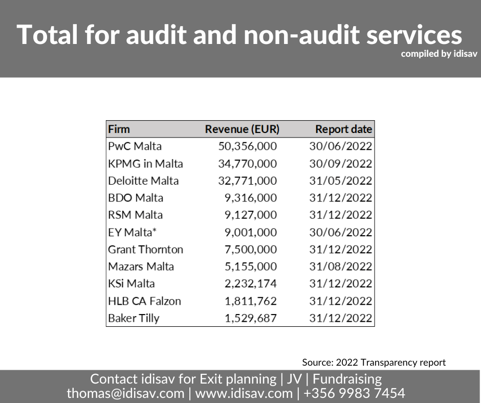 For instance, EY Malta is commonly recognized as one of the ‘Big Four’ firms in Malta. However, in the ‘Total for audit and non-audit services’ rankings, it appears in sixth place. Additionally, it’s worth noting that the firm’s Transparency Report financial information specifically pertains to the Assurance entity and does not encompass revenues from other EY Malta entities, such as Ernst & Young Limited, where an additional €12 million in revenue is disclosed (source: 30 June 2022 financial statements).