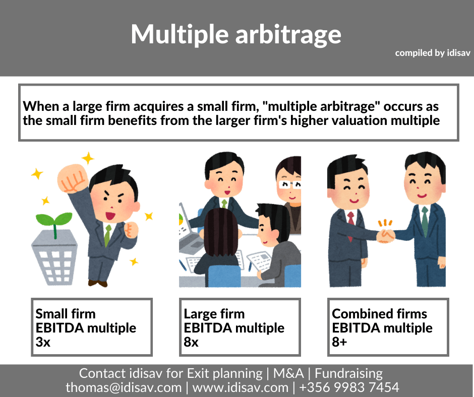 ‘Multiple arbitrage’ is a method often employed by private equity firms in their buy-and-build strategies. Though it has also been utilised (in Malta) in the pharmacy and grocery sector.